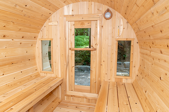 The Tranquility Sauna is a 78″ Diameter by 118″ Long (Including Porch) barrel sauna. This model features a built in front porch with benches so you have a cooling down area on the outside of the sauna as well some protection from the front door when it is opened during sauna use. The Tranquility also features two front windows allowing more natural light and a view! The round concept of the barrel sauna make it unique and very efficient to heat as well as encourages proper air flow during sauna use.